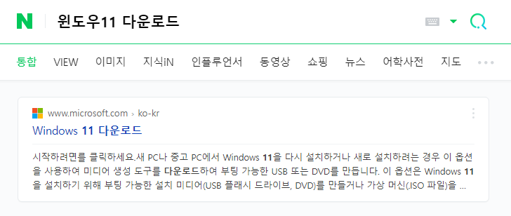 네이버에서 윈도우 11 다운로드 라고 검색하면 아래처럼 microsoft 다운로드 페이지가 겁색됩니다.