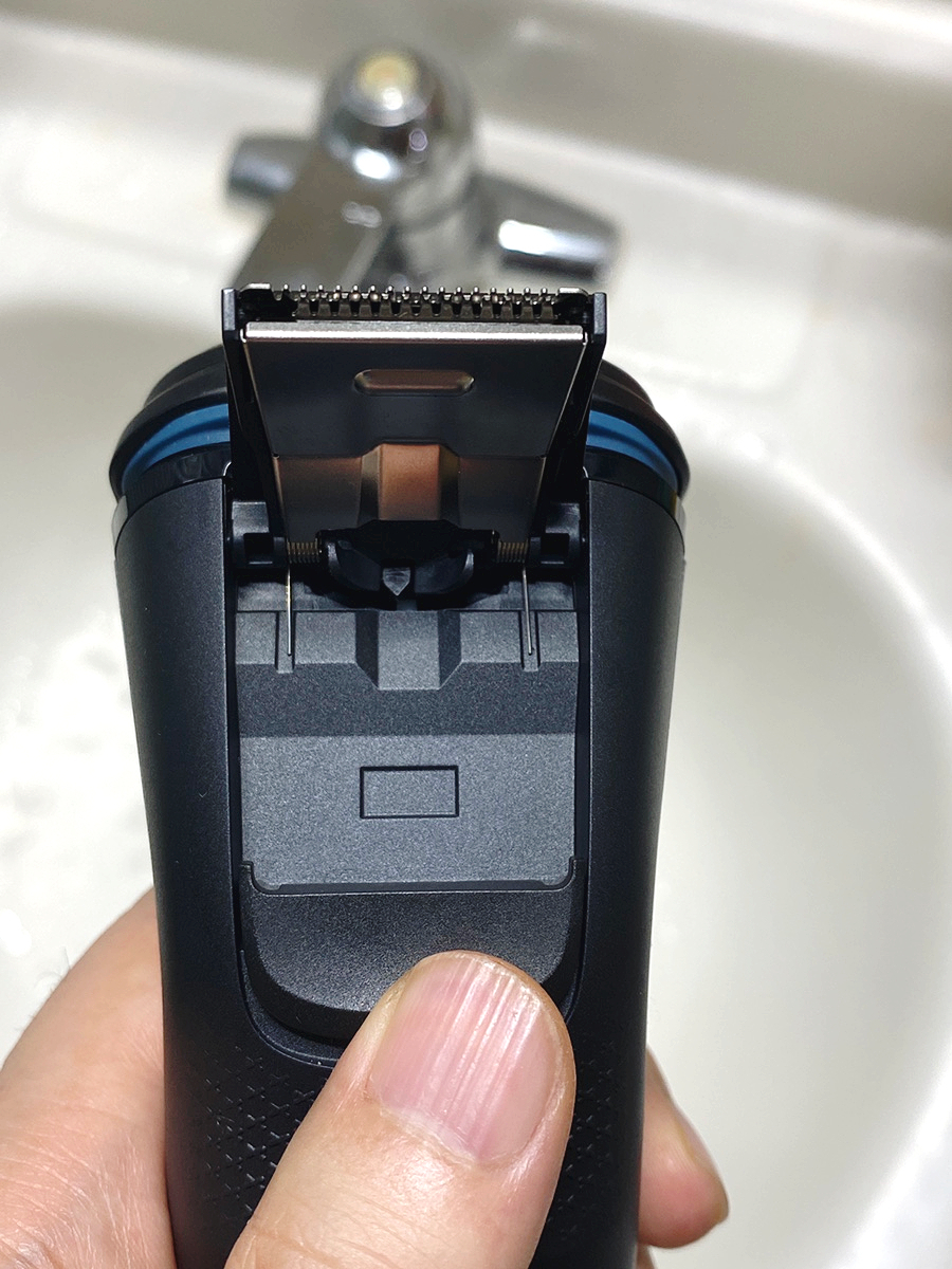 뒷면에 있는 버튼을 누르면 트리머가 세워져 구렛나루를 정리할 수 있어요