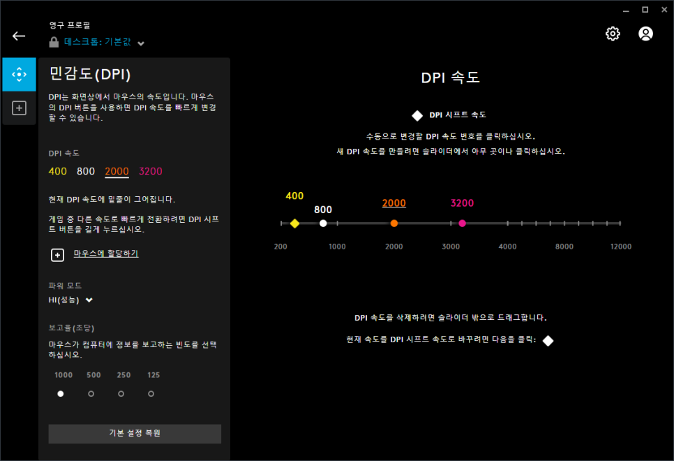 GHub 프로그램을 설치하면 DPI 설정, 파워모드 설정(배터리 절약 가능), 보고율(응답속도)를 조절할 수 있는데, 기본 설정은 파워모드 : HI, 보고율 1/1000초로 설정되어 있습니다.