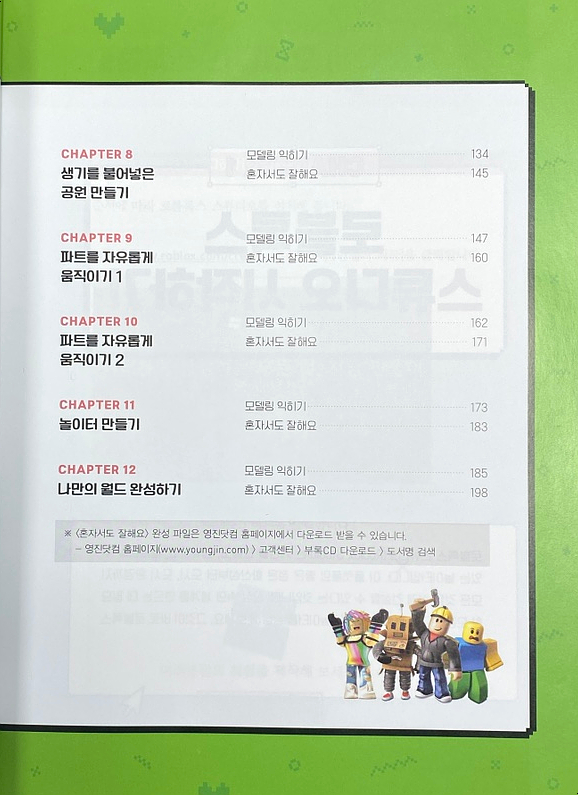 로블록스로 게임을 만들 경우 사물을 만드는 모델링과 이를 움직이게 하는 코딩과정이 필요한데, 영진닷컴에서 출판된 "로블록스로 만드는 나만의 상상 놀이터"는 모델링편과 코딩편 2권으로 출간되었습니다.