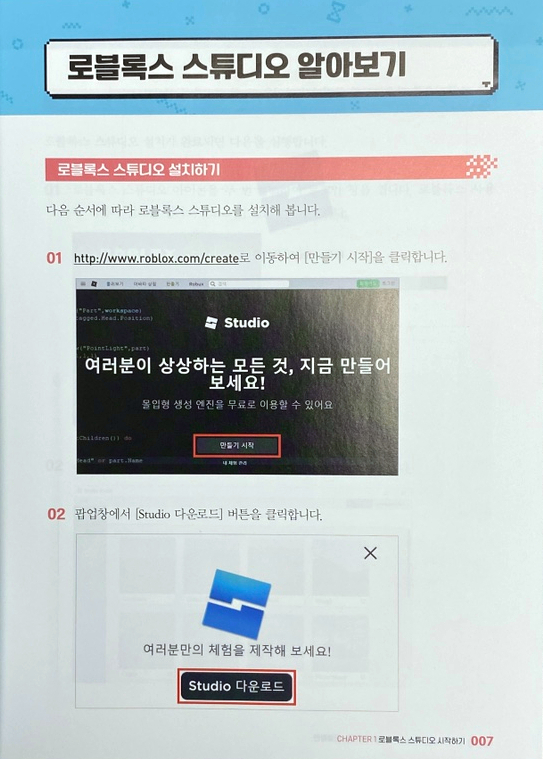 로블록스 스튜디오 설치와 기본 도구 사용법은 Chapter 1에 나와 있어서 어렵지 않게 따라할 수 있었습니다.