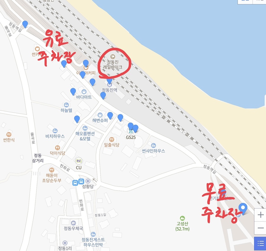 티맵에서 정동진 레일바이크 주차장으로 검색하면 유료 주차장으로 안내합니다.