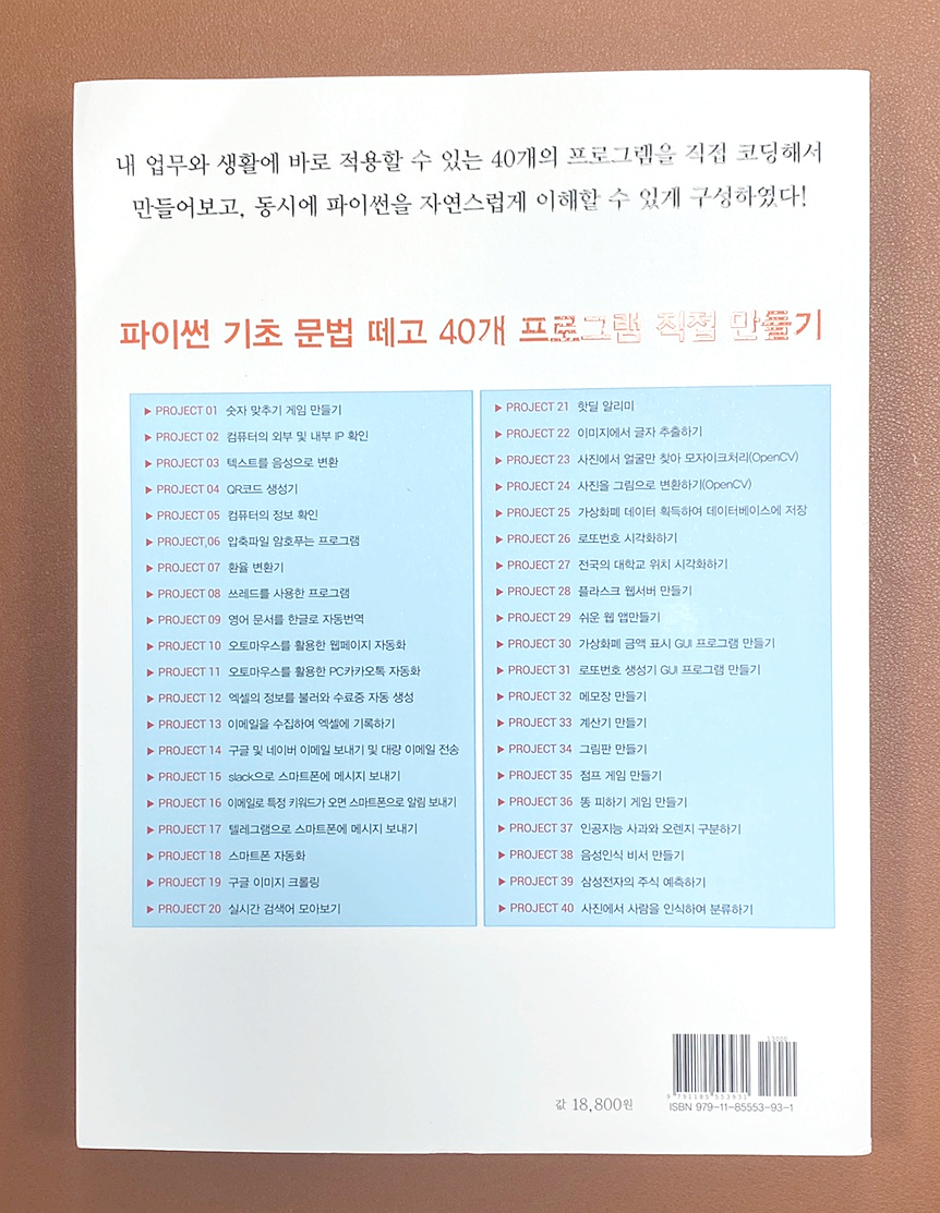 3장부터 소개하는 40개의 프로젝트는 가장 간단한 랜덤 함수를 이용한 게임, 웹사이트 정보를 수집하는 크롤링, 업무 자동화를 위한 RPA 등 실 생활에 도움이 될만한 예제가 많이 포함되어 있습니다.