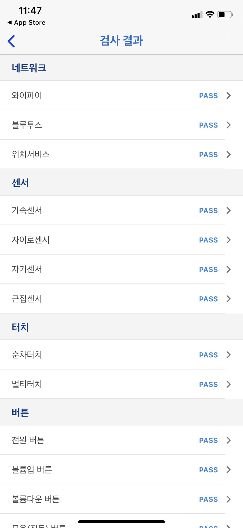 테스트 항목으로는 네트워크, 센서, 터치, 버튼, 터치, 카메라, 스피커 등 기기의 물리적인 성능 테스트를 진행하게 됩니다.