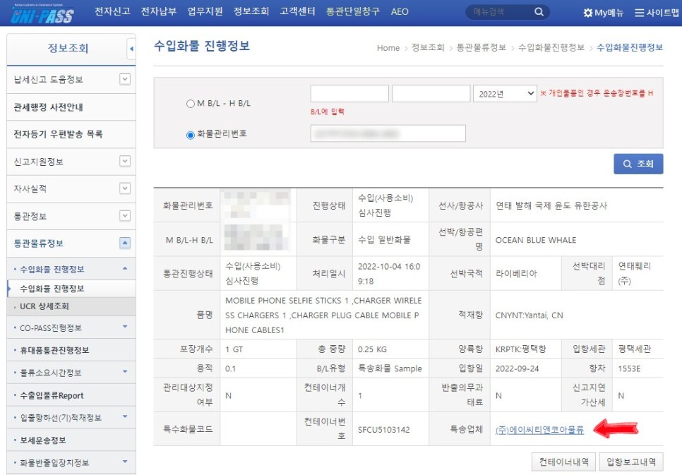 운송장 번호를 넣고 조회하면 화물관리번호가 조회되고 세부 상황을 알 수 있습니다.