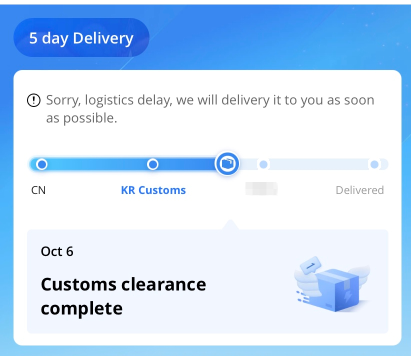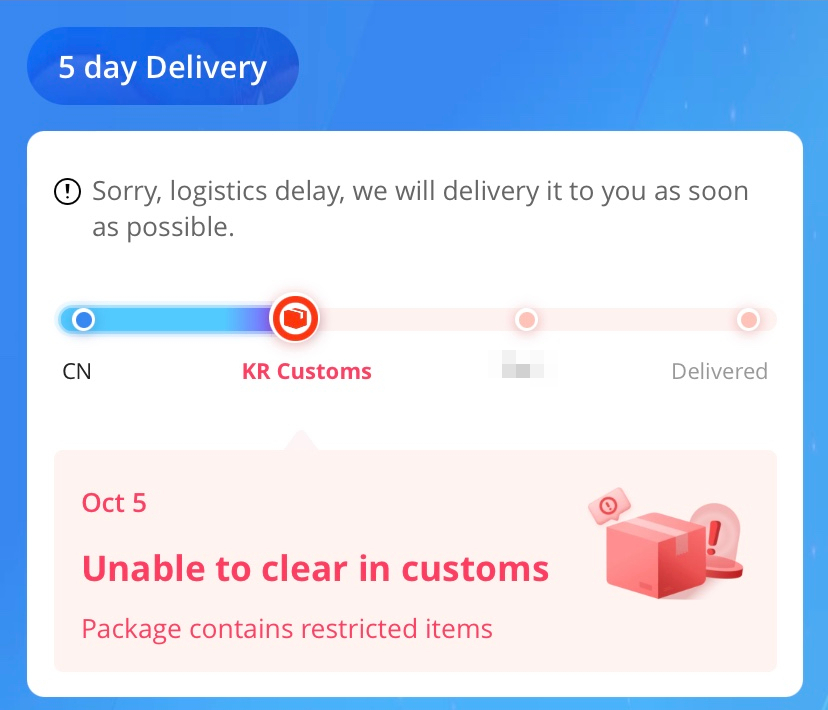 나중에 주문한 제품은 5일만에 도착했는데, 먼저 주문한 제품이 세관에서 통관실패되었습니다.