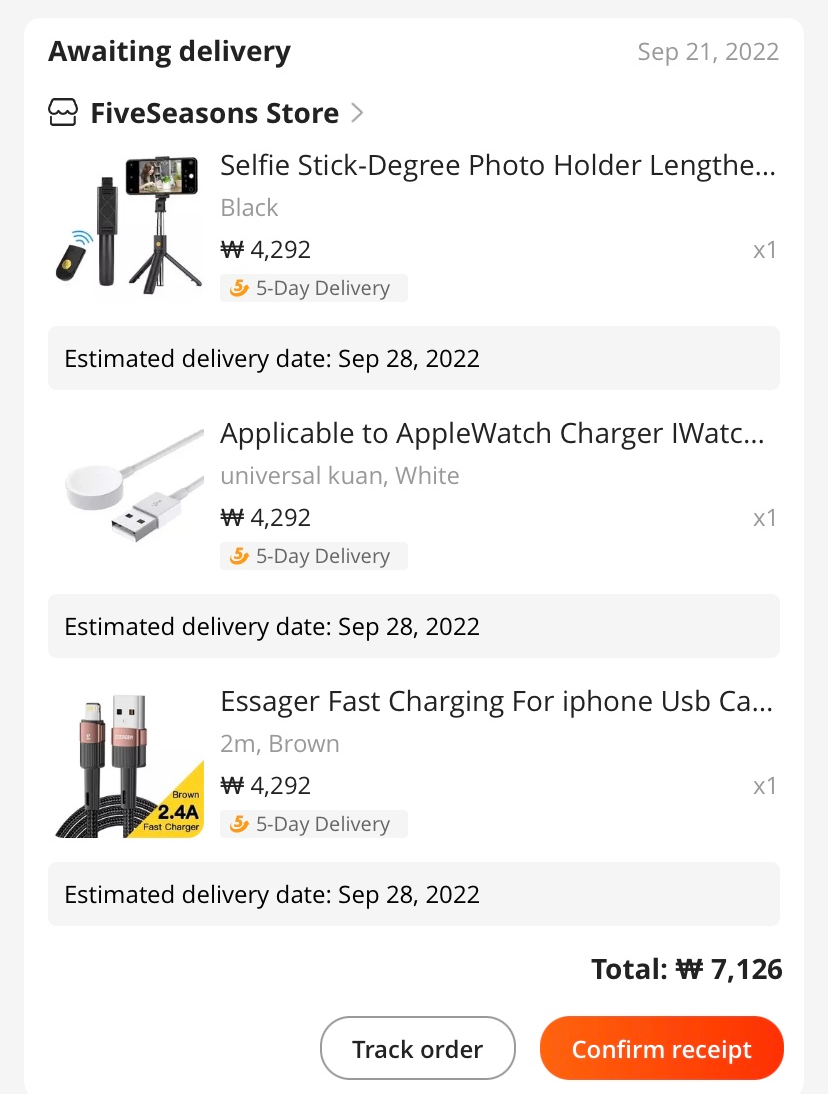 셀카봉, 충전 케이블, 애플워치 충전기 이렇게 3가지를 주문했기 때문에 통관에 문제가 될만한 상품은 아무것도 없었습니다.