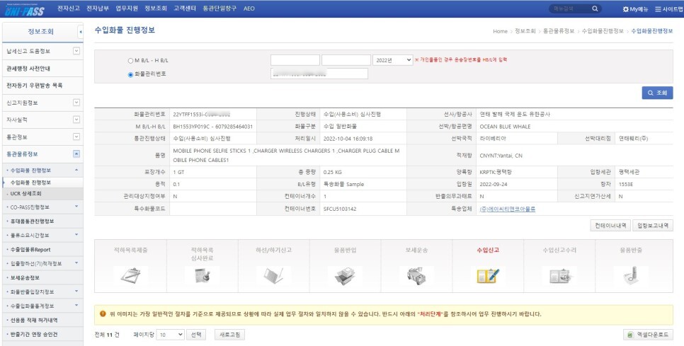통관 실패하고 답답한 마음에 관세청 전자 통관 시스템에 조회해보았습니다.
