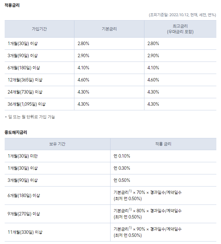 계산을 해보니 1달 넣은 예금 해지하고 새로 넣는 것이 더 이익이라 4.1%로 새로 가입하고 기존 예금은 1달에 해당하는 0.3% 중도 해지 금리기준으로 이자를 받았습니다.