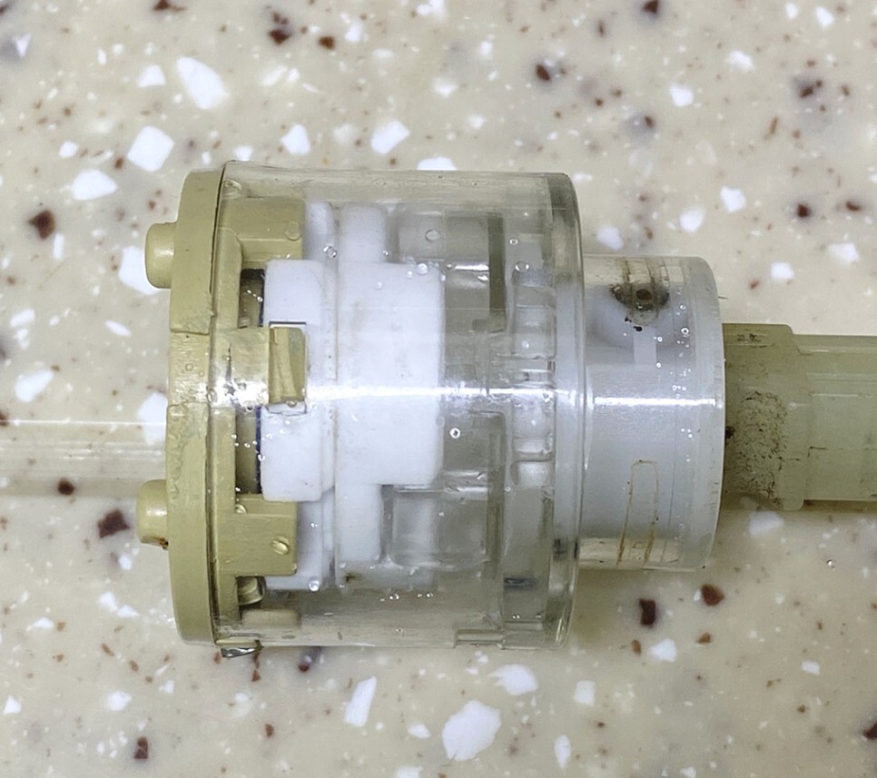 카트리지를 꺼내어 자세히 살펴보니 연결 부위가 깨져 틈이 발생해 새는 것으로 보입니다.