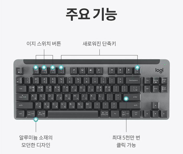 미니멀한 크기와 3개의 디바이스를 연결할 수 있는 기능을 통해 책상위를 깔끔하게 정리할 수 있으며, 기계식 키보드가 주는 키감으로 타이핑에 재미들 더해줍니다.