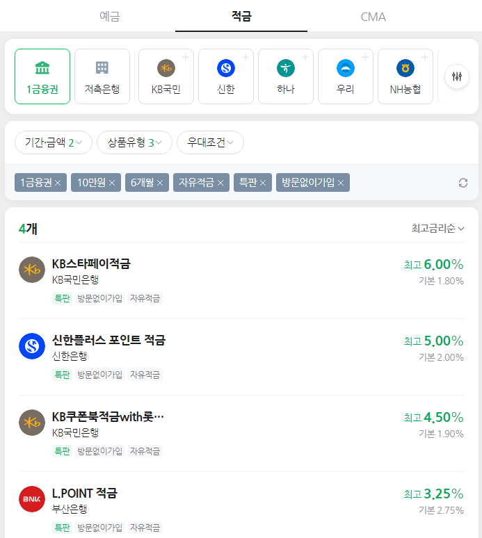조건은 단리, 스마트뱅킹 가입 기준, 6개월 금리를 기준으로 비교했을 때 기본금리는 우리은행 > SH 수협은행 = 스탠다드차타드은행 = 케이뱅크 순으로 노출되고 최고 우대 금리는 BNK부산은행이 가장 높네요.