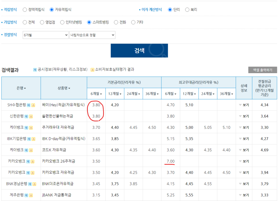 자유적립식, 단리, 스마트뱅킹 가입으로 6개월 적금일 비교해 보니 SH수협은행과 신한은행이 가장 높네요.