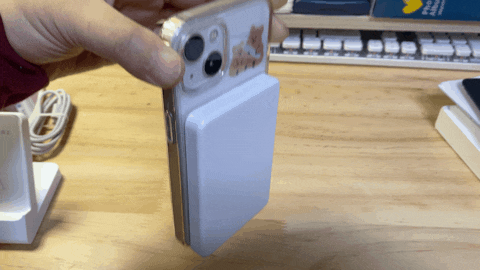 아이폰 13에 다이소 맥세이프 케이스를씌운 상태에서 맥세이프무선 충전 보조 배터리를 가까이 가져가면 착~ 하고 정확한 위치에 붙습니다.