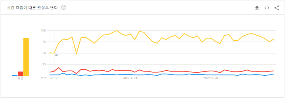 최근 1년간 구글 트렌드 CVS,SVN, Git의 관심도를 확인해보면 노란색의 Git의 관심도가 80%넘는 압도적인 점유율을 차지하고 있습니다.