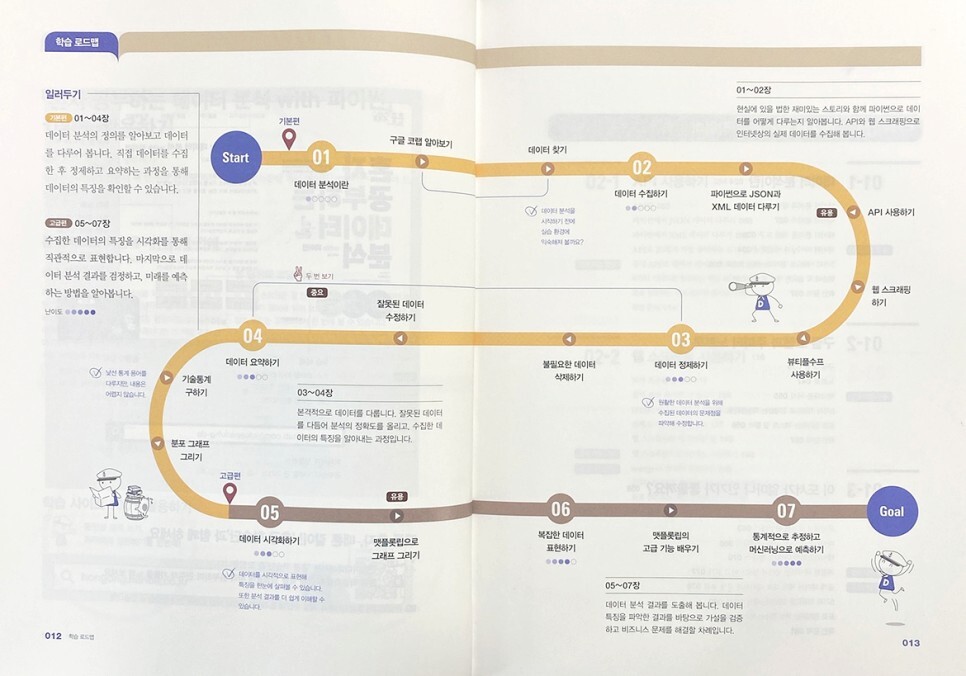 전체 학습 로드맵을 보면 데이터 분석을 위한 수집, 정제, 요약 과정을 거쳐 시각화하는 방법을 배우게 됩니다.