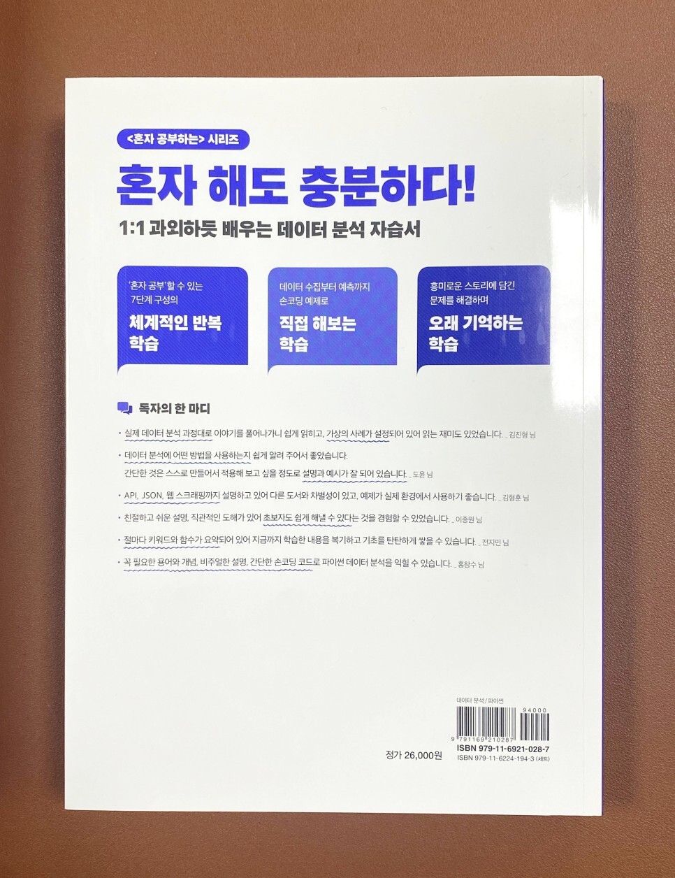 데이터 분석 공부를 하고 싶지만 어떻게 시작해야 할지 모른다면 [혼자 공부하는 데이터 분석 with 파이썬] 추천드립니다.