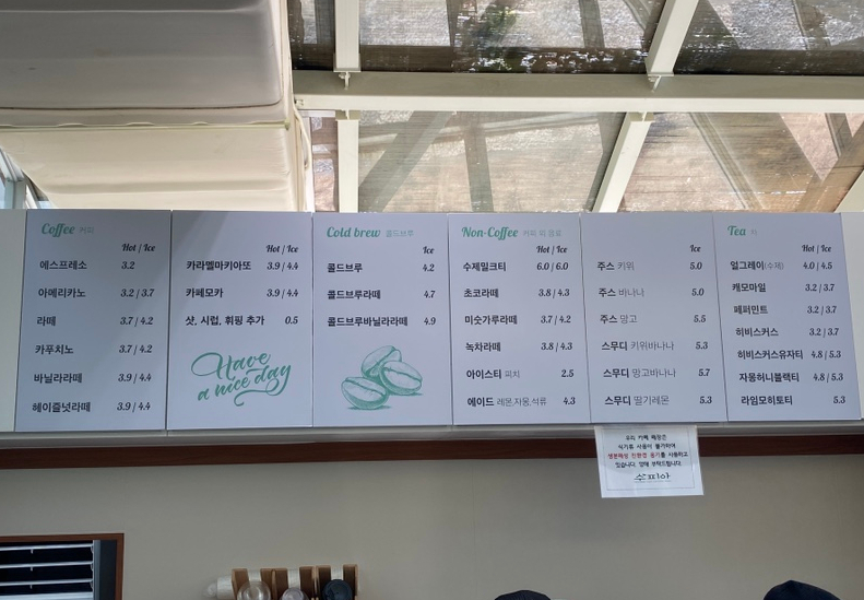 카페는 1층과 2층 2곳에 준비되어 있는데 음료 비용은 비싸지 않았어요.