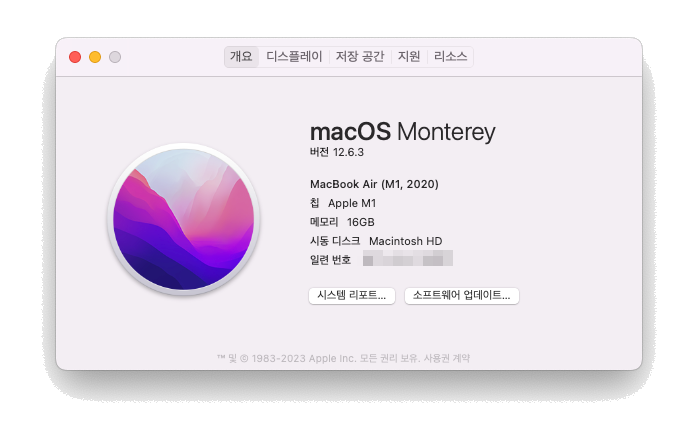 기존 몬터레이까지는 상단 사과모양을 눌러서 이 Mac에 관하여 > 시스템 리포트를 볼 수 있었습니다.