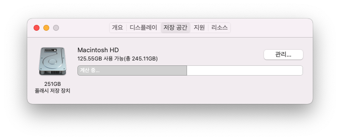 이 Mac에 관하여 > 저장 공간을 선택하면 SSD의 사용량도 바로 확인할 수 있습니다.