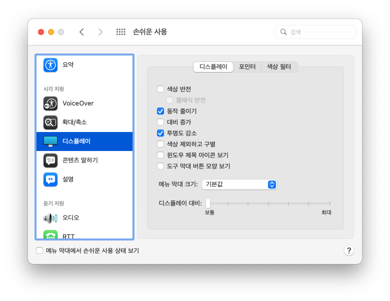 디스플레이 효과를 줄이면 상단메뉴와 독에 투명도나 폰트에 그림자 효과가 사라집니다.