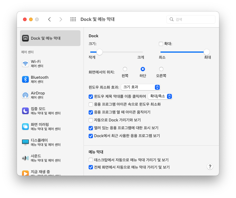 시스템 설정 > Dock 및 메뉴 막대