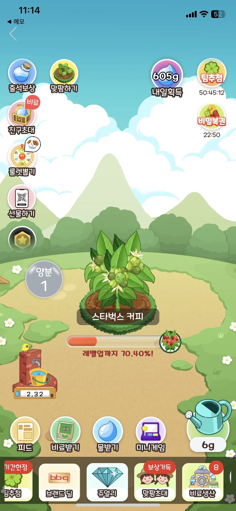 매일 매일 출석 보상받고 수시로 물을 줘야 빨리 자라는데요.
