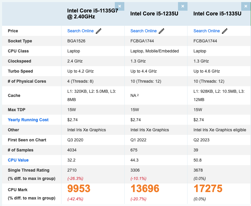 11세대(1135G7)과 12세대(1235U) 와 비교했을 때 20% 이상 빠른 성능을 보여주네요.