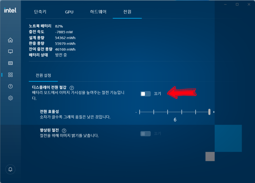 상단 전원 > 전원 설정 > 디스플레이 전원 절감 옵션을 끄기로 변경합니다.
