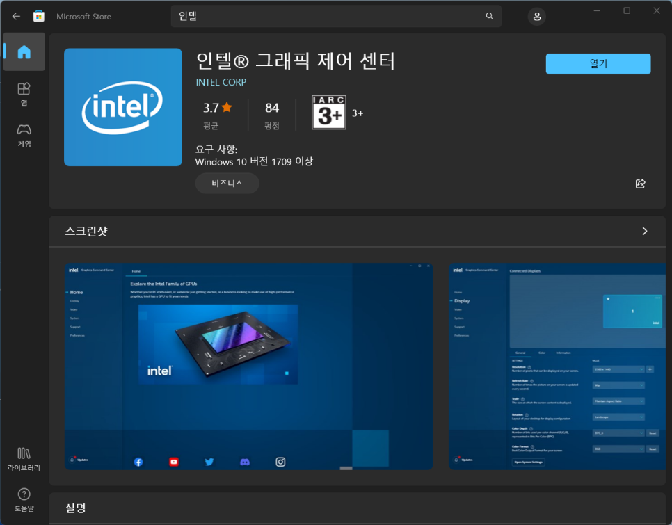 Microsoft sotre 에서 인텔 그래픽 제어 센터를 설치합니다.