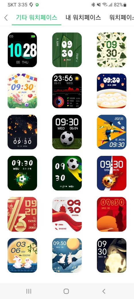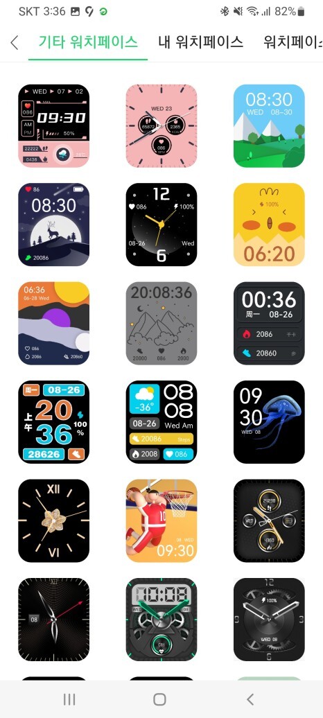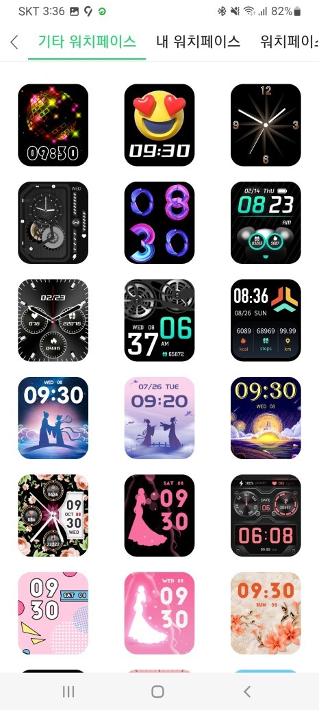 Gloryfit 앱에서 정말 많은 워치 페이스를 제공해주고 있었어요.