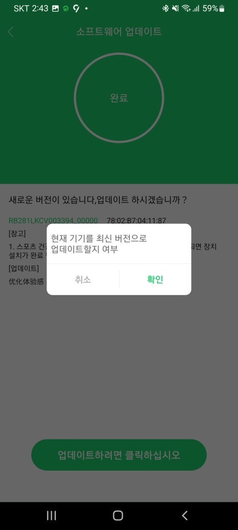 앱을 실행하니 기기 등록 화면이 떠서 등록 버튼을 누르니 등록되면서 자동으로 펌웨어 업데이트까지 진행되었습니다.