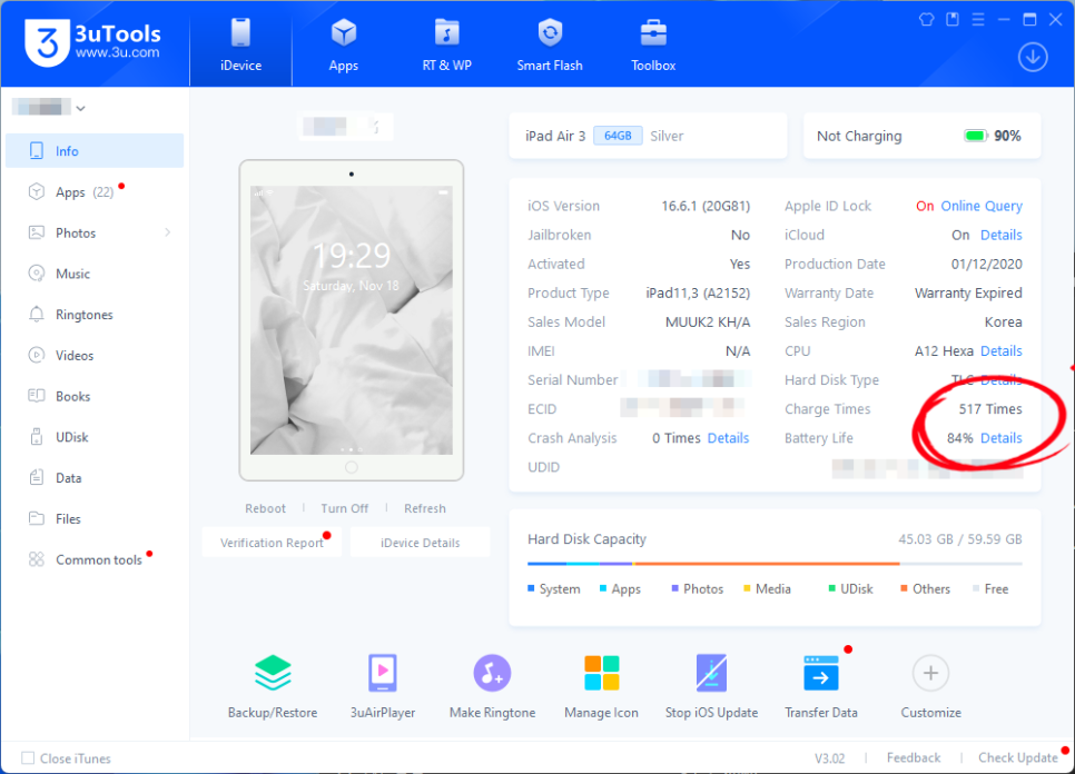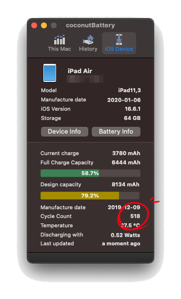 아래는 구입한지 3년 반이 지난 아이패드 에어 3를 윈도우와 맥에서 접속해 배터리 사이클과 배터리 수명을 확인한 것인데요.