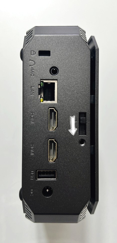 뒷면에서는 뚜껑을 열 수 있는 스위치, 3.5파이 헤드폰 잭, 유선랜 포트, HDMI * 2개, USB2, 전원 포트가 배치되어 있습니다.