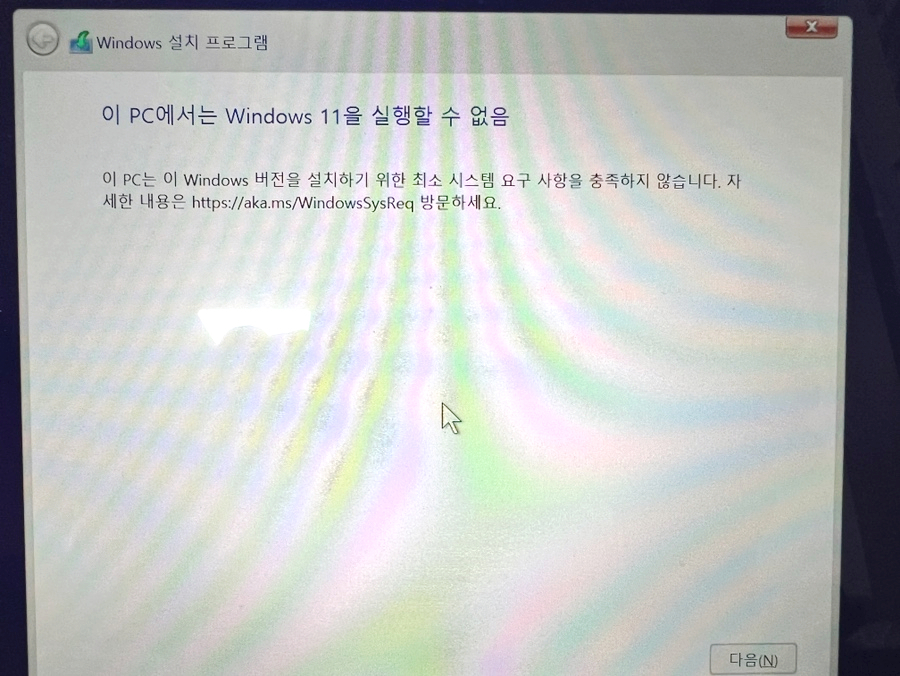 윈도우는 11로 설치를 시도했으나 최소 시스템 요구 사항을 충족하지 않는 다는 메시지가 뜨고 윈도우 11 설치가 불가능했습니다. 찾아보니 CPU 기본 클럭이 800Mhz라서 안된다고 합니다.