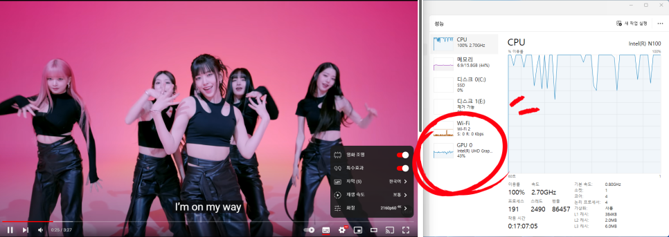 아래 8K 60fps 동영상의 경우 GPU가 84%까지 올라갔지만 끊김없이 잘 플레이되었는데, 화면전환이 빠른 8K 60fps 뮤직비디오의 경우 살짝 끊김이 생겼습니다.