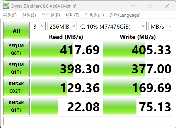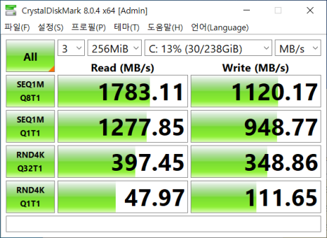 이 NVME SSD를 다른 노트북에서 테스트할 때 70도정도까지 올라갔던 것에 비하면 10도 정도 더 올라가네요.