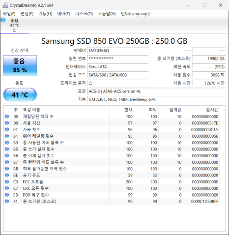 속도는 일반적인 SATA 속도는 나와주었지만 중국산 SSD들이 그렇듯이 온도센서가 없어 온도는 항상 41도로 고정되어 있어 온도 측정이 불가능했습니다.