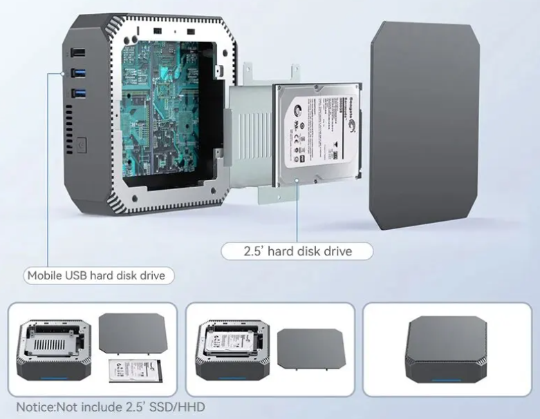 T8는 크기가 작으면서서 DDR5에 NVME SSD가 장착되어 있고, AK2 Plus는 DDR4에 M2.SATA SSD가 장착되어 있고 2.5인치 SSD 확장이 가능합니다.