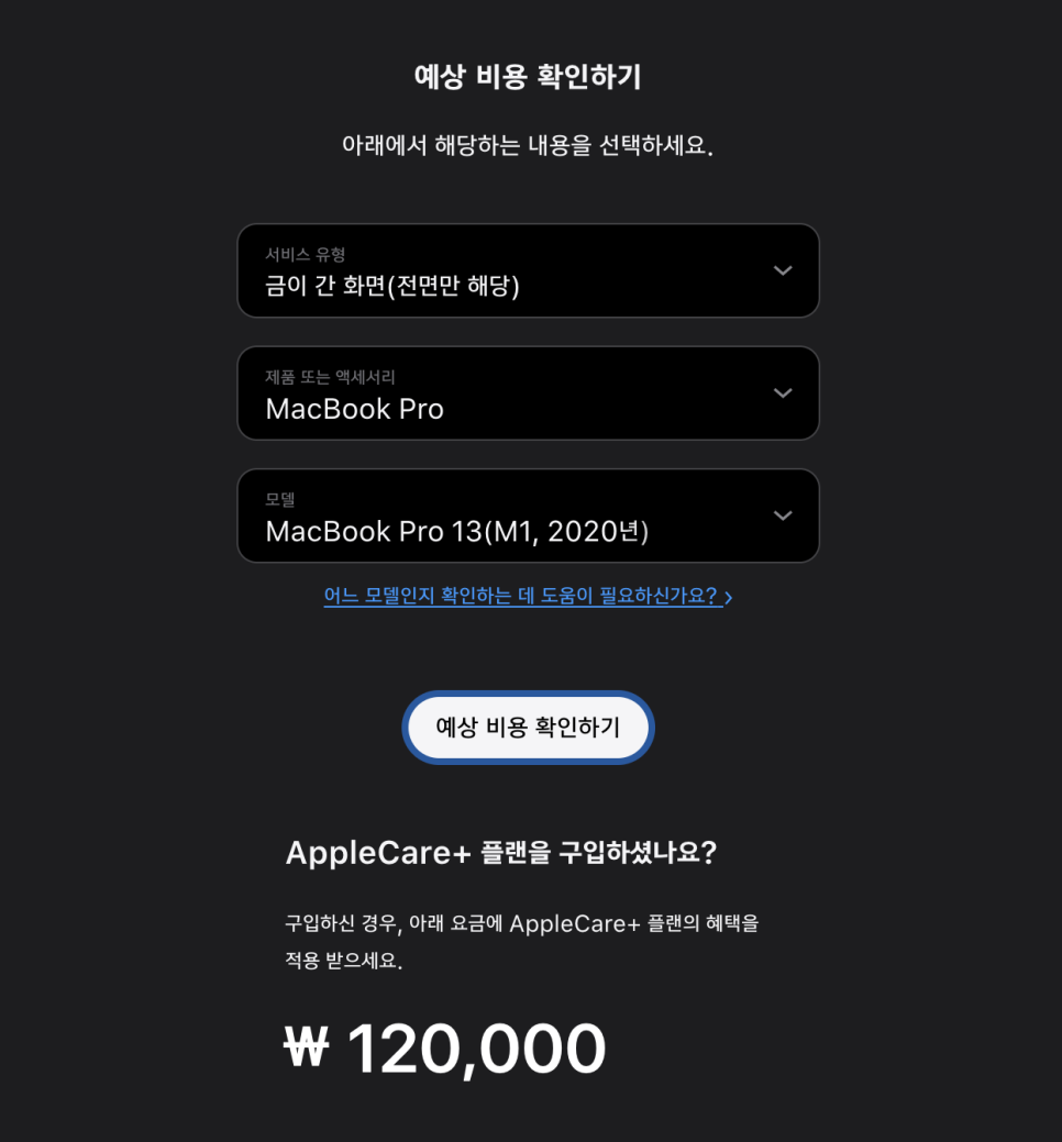 애플케어에 가입되어 있다면 수리비가 12만원만 청구되지만 애플케어가 끝난 M1 맥북 프로(a2338)의 경우 액정 수리 비용이 어마어마 한데요.