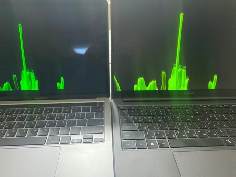 순정 상태의 맥북 액정과 차이를 비교해 보기 위해 수리 이력이 없는 m1 맥북 에어와 비교해보았습니다.