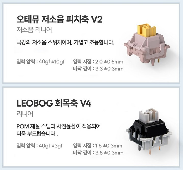 그레이축과 저소음 피치축은 모두 입력 압력이 40gf으로 매우 가벼운 키감을 제공합니다.