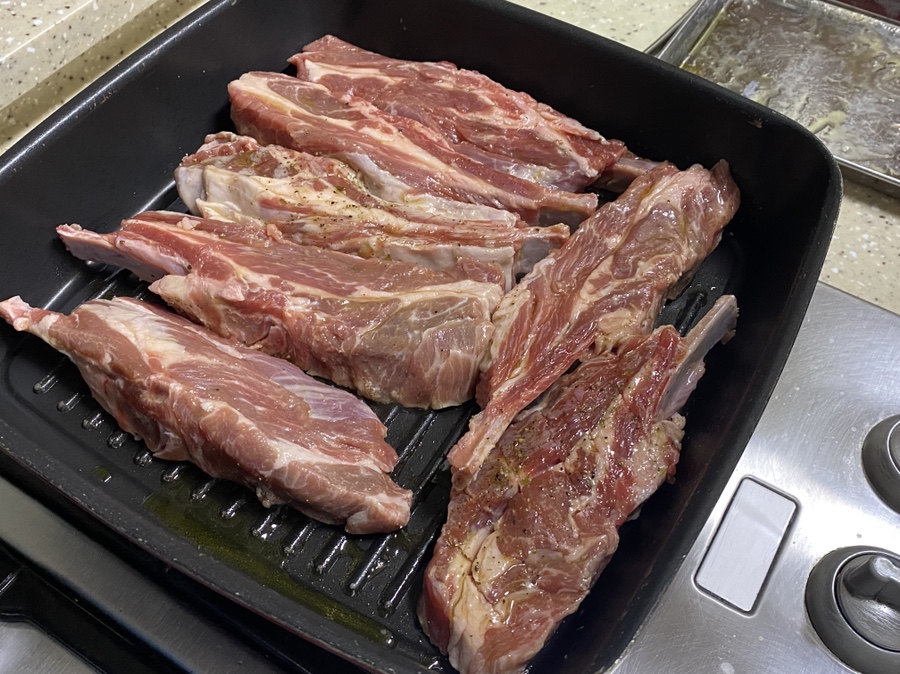 핏물 뺀 고기에 칼집을 내고 올리브유를 바르고 후추와 소금으로 재놨습니다.