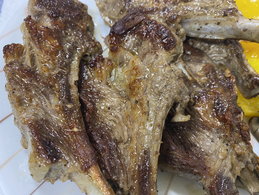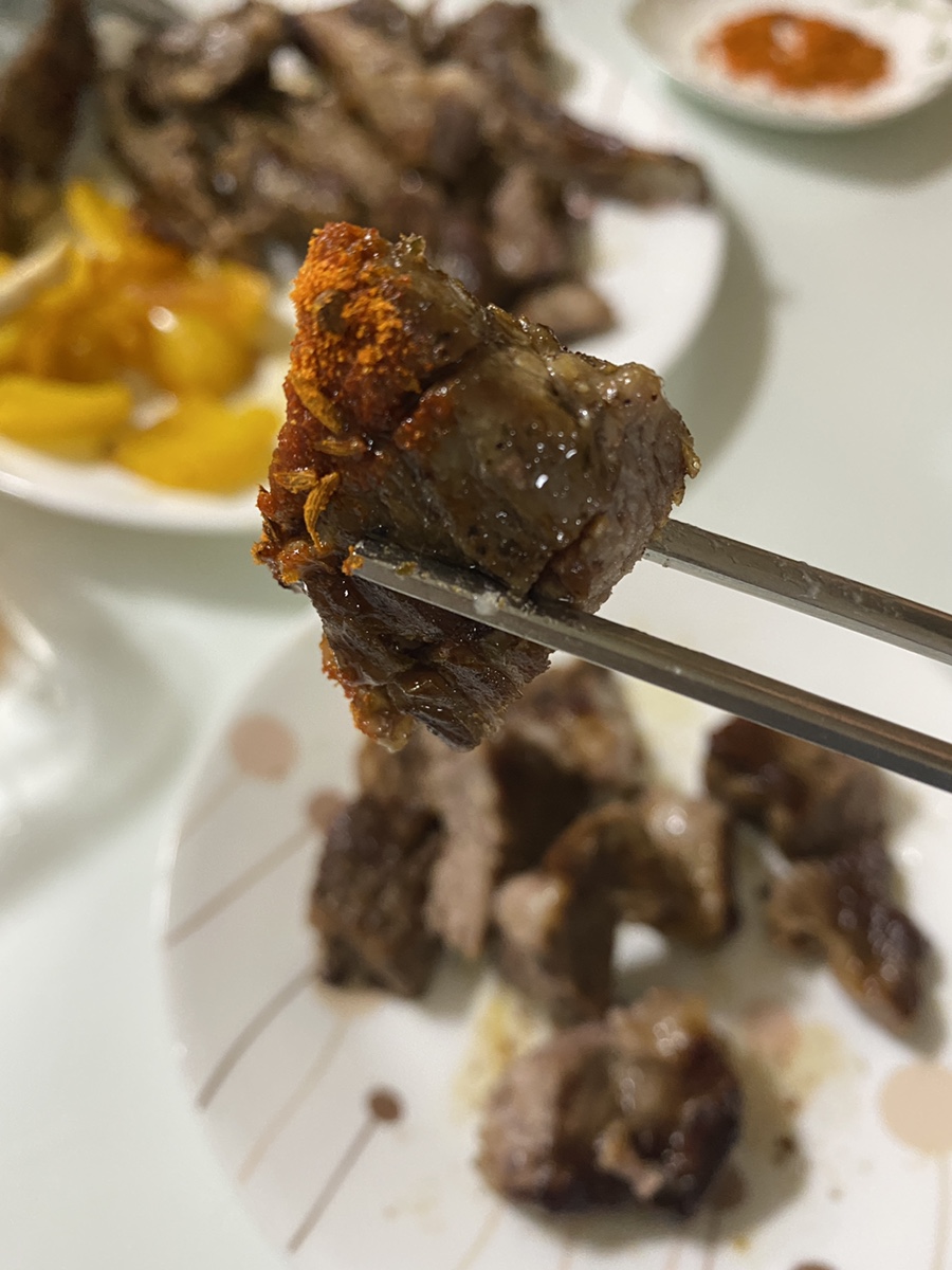 갈빗대를 잡고 먹어도 되고 가위로 작게 잘라서 쯔란에 콕 찍어 먹어도 먹어도 맛있답니다.