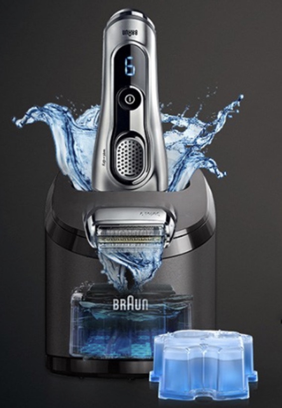 세척키트가 없는 브라운 면도기 중 방수가 지원되는 모델이라면 세척액에 헤드부분을 담그고 전원 버튼을 누르고 10초 ~ 15초 정도 담그고 있으면 깨끗하게 세척됩니다.