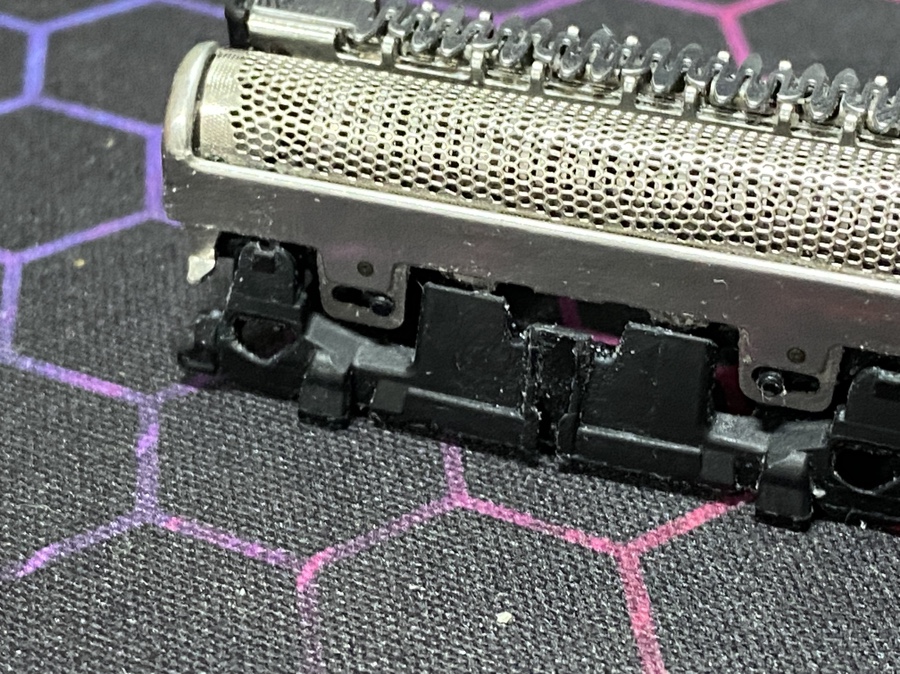 면도기 구입 시 포함되어 있던 솔과 세척키트를 이용해 주기적으로 청소했지만 시간이 지나면서 피지와 쉐이빙폼 잔유물들이 사이에 끼어 있는 것을 볼 수 있습니다.