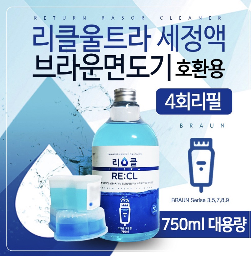 위 사진과 같은 세척 키트가 있다면 평소에 면도 후 세척버튼만 눌러주면 되는데 만약 세척 키트가 없다면 세척액 리필을 구입해서 작은 통에 담아 이용할 수도 있습니다.