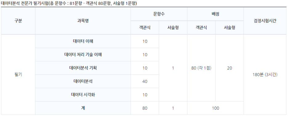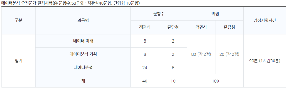 데이터분석 전문가는 준전문가보다 기준이 높은 70점이며 과락은 40점으로 동일합니다.