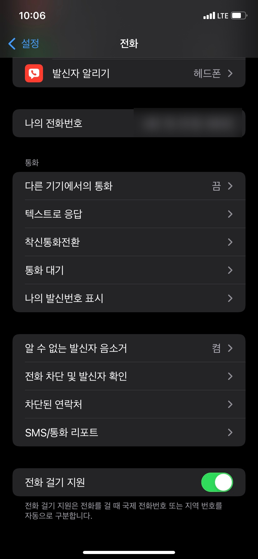 아이폰 설정 > 전화 메뉴에 들어가면 하단에
