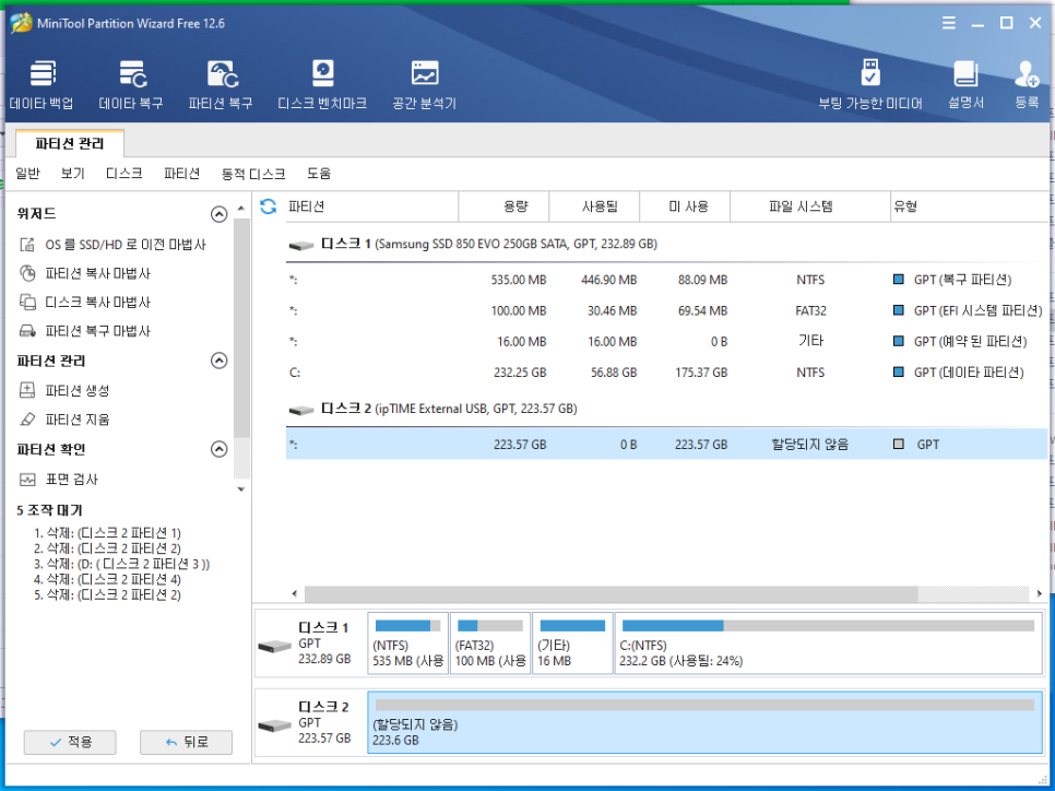 모든 파티션을 삭제하면 할당되지 않은 하나의 디스크만 보입니다.